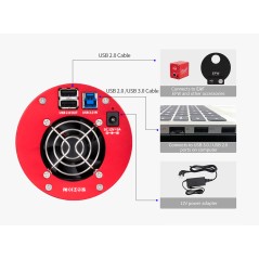 Răcire TEC și Hub USB 2.0 Sistemul de răcire termoelectrică în două trepte menține senzorul la o temperatură constantă cu până la 35°C sub temperatura ambientală, reducând zgomotul termic la minim. În partea din spate, camera include un hub USB 2.0 cu două porturi, permițând conectarea facilă a dispozitivelor suplimentare, precum un focuser electronic (EAF) sau o roată de filtre.