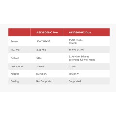 ZWO ASI2600MC Duo este o cameră astronomică revoluționară care integrează un senzor de ghidaj direct în corpul camerei principale. Bazată pe celebrul senzor color format APS-C (Sony IMX571), versiunea "Duo" elimină necesitatea unei lunete de ghidaj separate sau a unui dispozitiv OAG extern. Prin plasarea unui al doilea senzor dedicat lângă cel principal, ASI2600MC Duo oferă un sistem de ghidaj extrem de precis, liber de flexiuni mecanice, totul printr-un singur cablu USB 3.0.