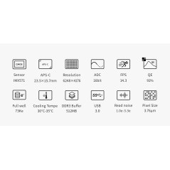 Senzor Monocrom APS-C cu ADC pe 16 biți Utilizarea senzorului monocrom IMX571 permite captarea semnalului brut fără pierderile cauzate de o matrice de culoare, oferind detalii și contrast superioare. Camera dispune de un convertor analog-digital (ADC) pe 16 biți, capabil să genereze un interval dinamic de 14 trepte. Această caracteristică asigură o profunzime incredibilă a imaginii, păstrând detaliile fine atât în zonele luminoase, cât și în cele mai întunecate regiuni ale cerului.